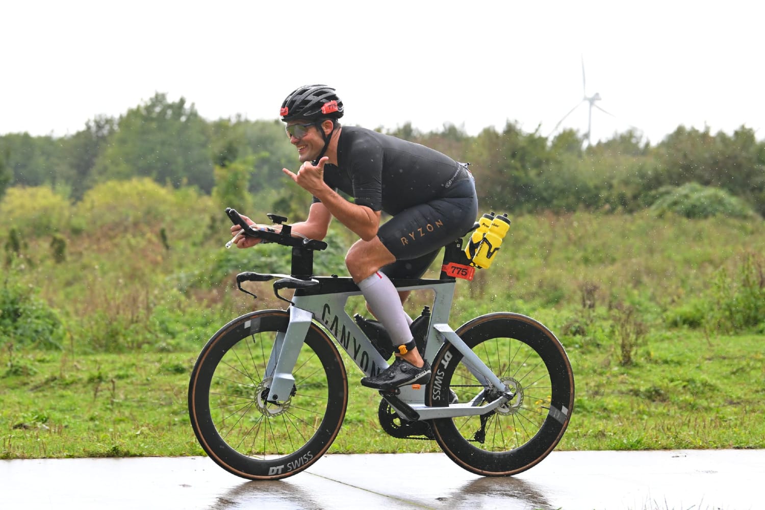 Done! What a day. It has been amazing and challenging. Wind, rain, a bottle down and a flat tire - not exactly what you wish for during your first long distance race.